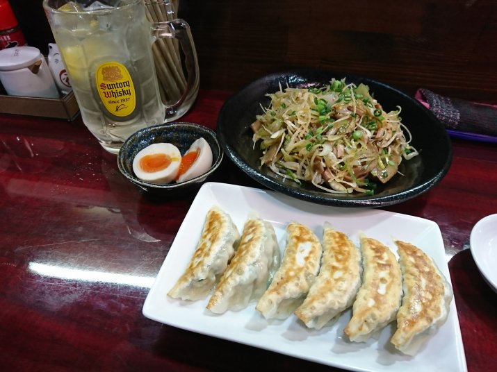 辛葱メンマと餃子と味玉でご飯とハイボール。
