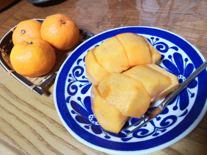 お風呂前にいただいた柿とみかん。